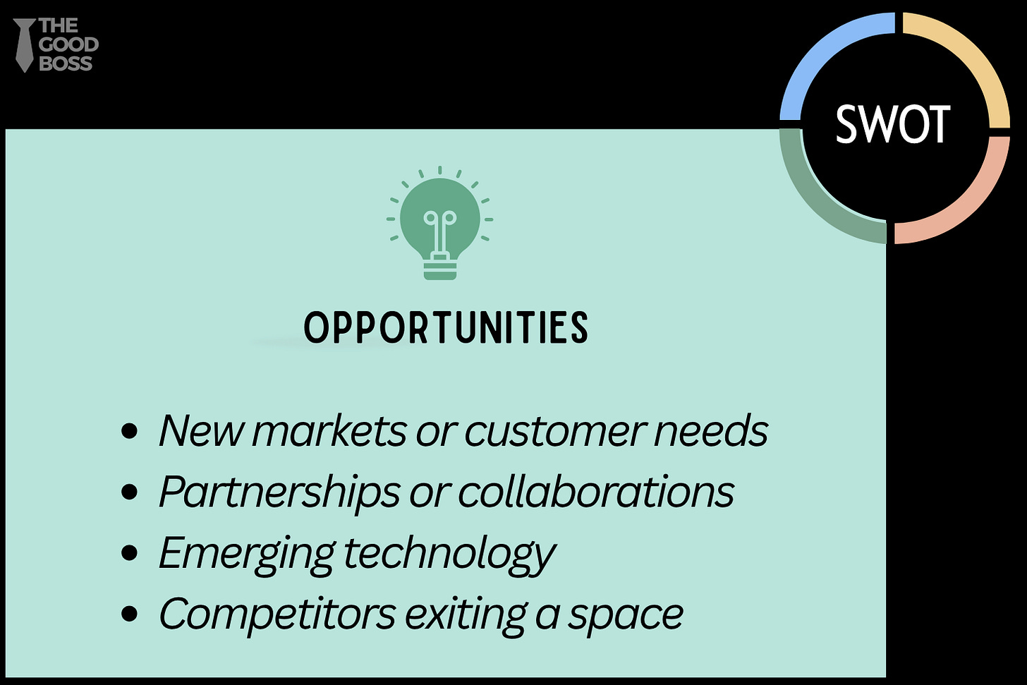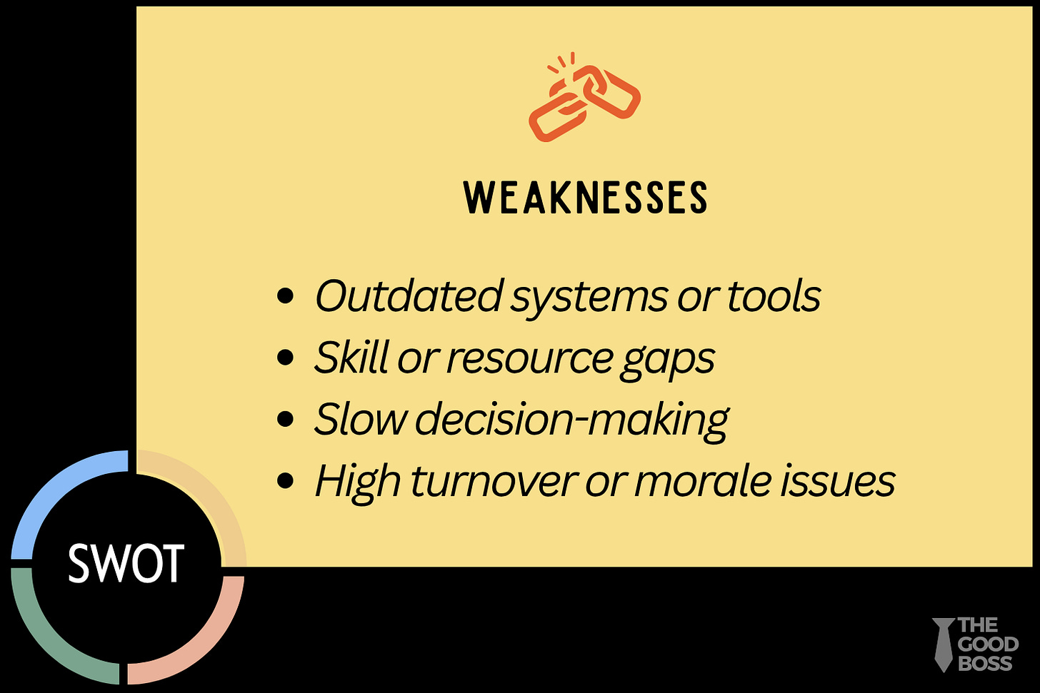 These are the internal factors holding you back. Most leaders hesitate to admit weaknesses, but a good SWOT analysis is brutally honest.
