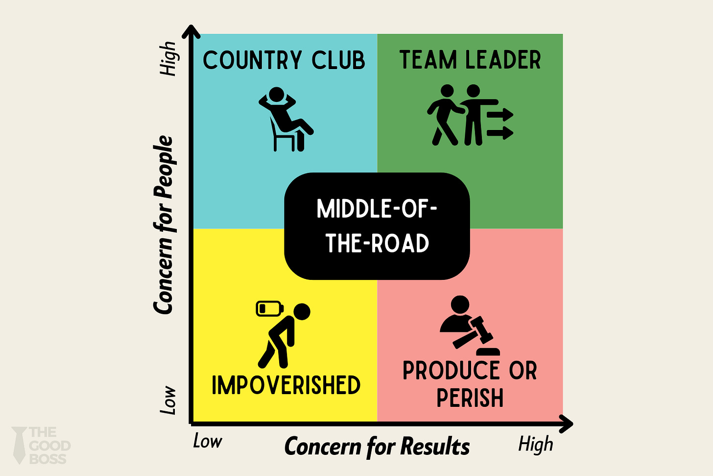 Once you understand the two core concerns (people and results), the next question is: what happens when a leader leans too far in one direction, or not enough in either?